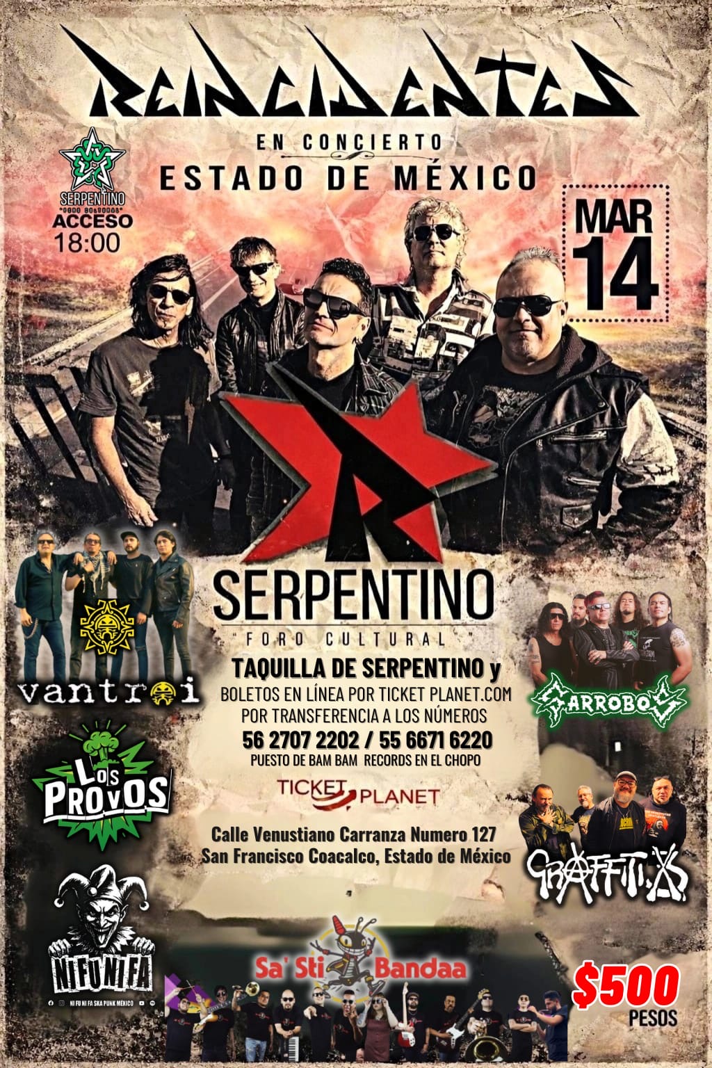 Con casi cuatro décadas de trayectoria y una historia construida desde la trinchera del punk combativo, Reincidentes regresan a territorio mexiquense para protagonizar una de las noches más intensas del circuito independiente este sábado 14 de marzo de 2026, cuando se presenten en el Foro Cultural Serpentino, ubicado en Coacalco, Estado de México, en un concierto que promete convertirse en un punto de encuentro para la comunidad punk, rockera y contracultural de la región. Los boletos tienen un costo de $500.00 en el sistema TicketPlanet en ticketplanet.com y en el Tianguis del Chopo en el Puesto de BamBam.